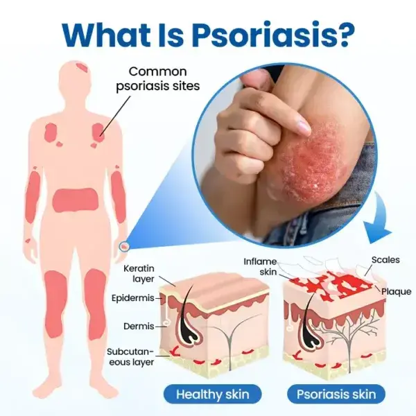 Psoriasis is a persistent autoimmune condition where the immune system incorrectly targets healthy skin tissue, causing accelerated cell production and accumulation. This results in inflammation, scale formation, and characteristic psoriasis patches, which may develop on any body part but frequently appear on the scalp, elbows, knees, and lumbar region.
